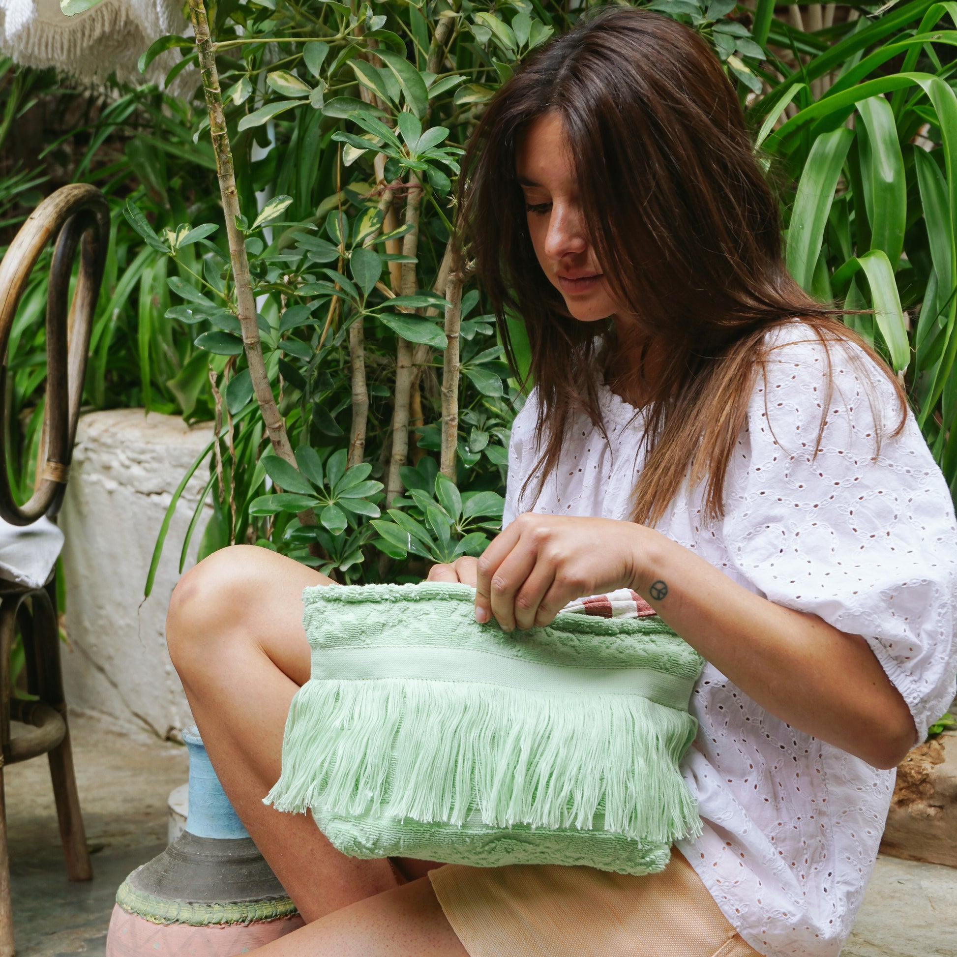 WASHING: This item requires little upkeep. In case it gets stained, we recommend to remove it with a cloth and lukewarm water with a natural soap. Leave it to dry flat, in the open air. TIPS FOR LOOSE THREADS IN THE TERRY: Loose threads may appear due to sharp objects - but no worries, they can be easily removed by using scissors. After, the fabric will look like new again!