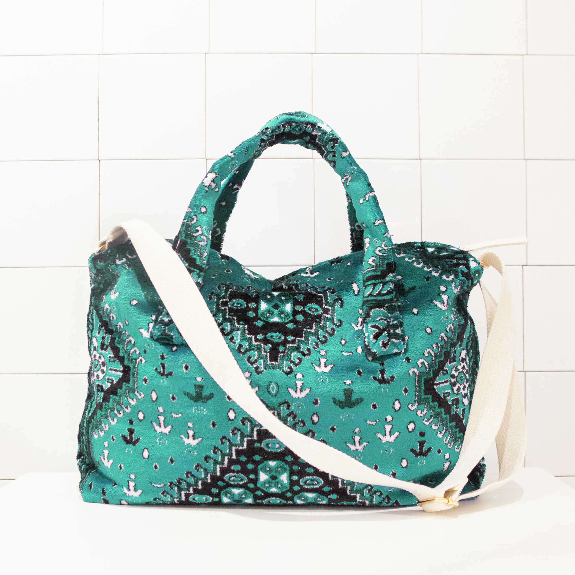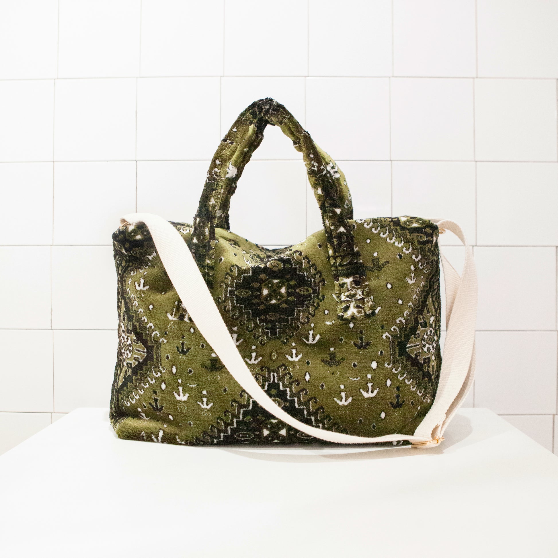 Crossbody carpet bag with its adjustable off white cotton strap.